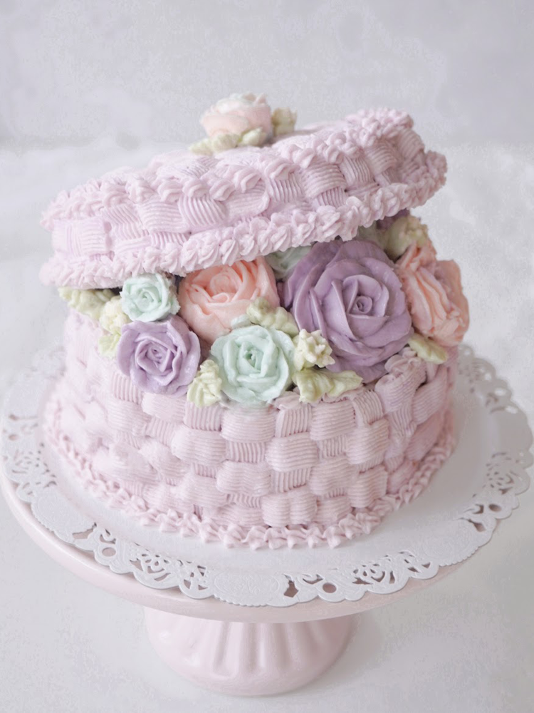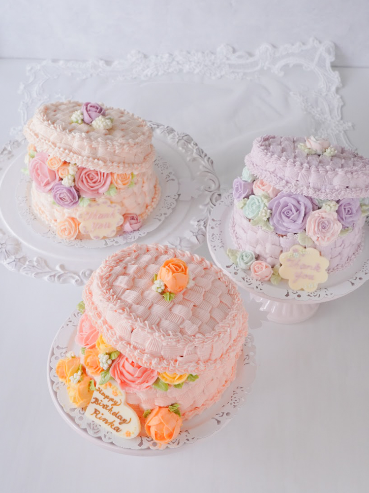 淡い色から濃い色へのグラデーションカラーでバラを絞り、立体的なバスケット絞りでケーキを仕上げます。